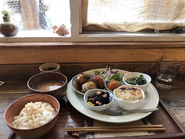 セノバ近くの身体に優しい菜食ごはんと野菜中心のおかずのいただけるロコマニさんに行きました。 ワンプレートランチを注文しました。少しずつ色々な種類のお惣菜を頂けるのも嬉しく、小さいお店ですがとてもほっこりくつろげました。混んでいましたが、先にお料理提供時間伝えて頂いたので良かったです。米粉のケーキや白砂糖など不使用の身体に優しい焼き菓子も豊富なのでおやつだけ買いに行くのもおススメです。 (投稿:2018/03/31 掲載:2018/05/30)